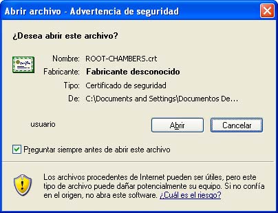 Para descargar el certificado “Chambers of Commerce ROOT” debe pulsar sobre el enlace “certificado” que aparece a la derecha del nombre. A continuación se abrirá la siguiente ventana en la que tiene la opción de “Abrir” (para instalarlo directamente) o “Guardar”: